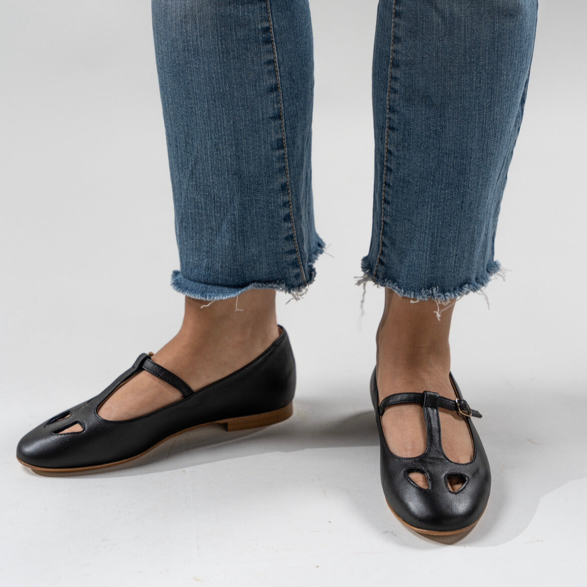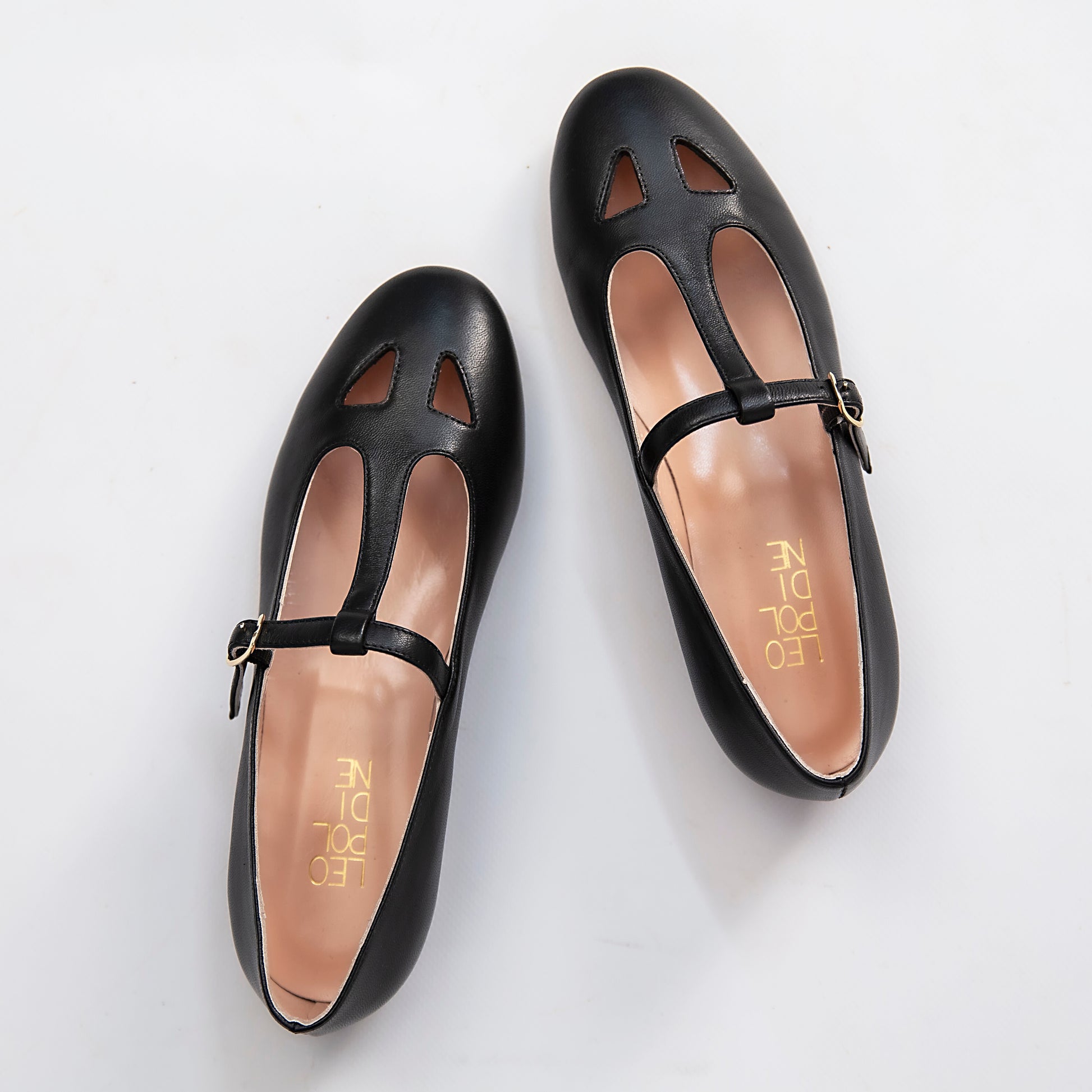Le nostre scarpe T-bar con gli occhietti, un connubio perfetto di stile e funzionalità. Realizzate in morbida nappa nera, queste scarpe sono ideali per chi cerca un tocco di originalità.